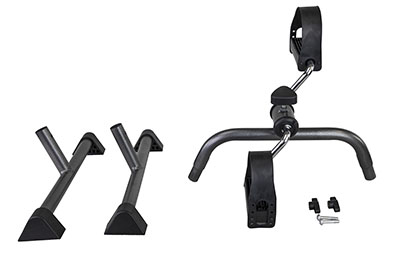 This is a five-piece Upper Body accessory kit designed for exclusive use with the CanDo Deluxe Chair Cycle. A lower body exerciser, this chair cycle provides the therapeutic benefits of cycle exercise to those confined to a wheelchair or unable to sit comfortably on a conventional exercise cycle. These accessories allow the upper extremities to now get the same benefits of the lower ones - restoration of muscle strength and improved coordination. The set includes left and right-hand straps, left and right extension arms and a long front leg wall support. Pedaling of the arms improves blood circulation and increases strength and flexibility after an injury or surgery. Ideal for keeping the elderly flexible and active. A convenient turning knob on the unit makes it possible to adjust the resistance, resulting in a progressive exercise program. Please note, the extension arms must never be used for leg exercise. Comes with a fully illustrated instruction guide. Attaching the extension arms to the long pedal arms increases the pedal arm radius and range of motion. The hand straps provide additional support to the hands and wrists during upper extremity exercise. Weak hands are not a deterrent for upper body exercising. A spring on the hand support fits into a slot on the pedal platform, so a firm grip isn't needed. The resistance adjusts from 0-29 lbs. allowing users to customize the workout that is best for them. Easy to clean with a damp cloth and mild dish soap.