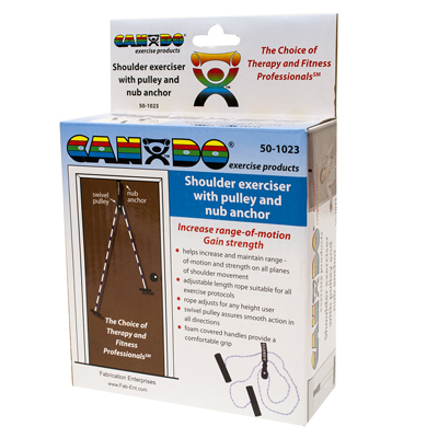 CanDo overdoor shoulder pulley with single pulley and door jamb anchor nub is used to increase should range of motion. Pulley with anchor nub is the most economical and lightweight shoulder pulley solution. Each pulley has a swivel hook for seamless pulley action and large foam handles for comfortable grip. Extra-long rope can be used in the standing or seated position. Each exerciser comes standard with instructions pamphlet and retail packaging.