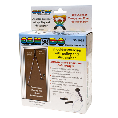 CanDo overdoor shoulder pulley with single pulley and door disc anchor is used to increase should range of motion. Pulley with door disc anchor is a heavy-duty shoulder pulley solution. Each pulley has a swivel hook for seamless pulley action and large foam handles for comfortable grip. Extra-long rope can be used in the standing or seated position. Each exerciser comes standard with instructions pamphlet and retail packaging.
