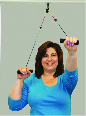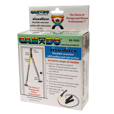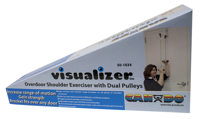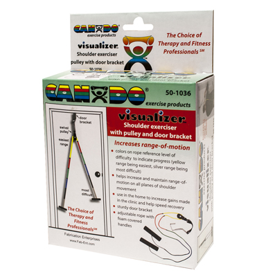 CanDo Visualizer deluxe overdoor shoulder pulley is used to increase should range of motion. Visualizer rope allows user to achieve specific pre-defined levels of ROM. It is color-coded by ROM from yellow (least) to silver (most). Deluxe exerciser has 2 pulleys and bracket for smooth and easy operation. Portable exerciser can be easily transported and fitted to most doors. Each pulley has a swivel hook for seamless pulley action and large foam handles for comfortable grip. Extra-long rope can be used in the standing or seated position. Each exerciser comes standard with instructions pamphlet and retail packaging.