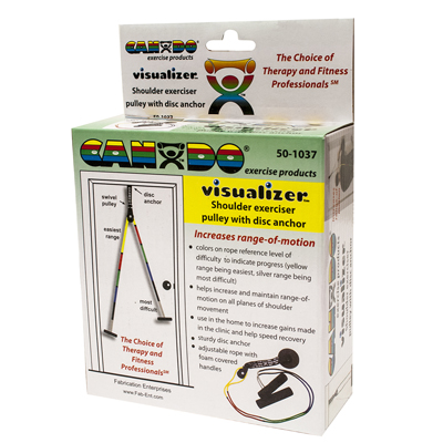 CanDo Visualizer overdoor shoulder pulley with single pulley and door disc anchor is used to increase should range of motion. Pulley with door disc anchor is a heavy-duty shoulder pulley solution. Visualizer rope allows user to achieve specific pre-defined levels of ROM. It is color-coded by ROM from yellow (least) to silver (most). Each pulley has a swivel hook for seamless pulley action and large foam handles for comfortable grip. Extra-long rope can be used in the standing or seated position. Each exerciser comes standard with instructions pamphlet and retail packaging.