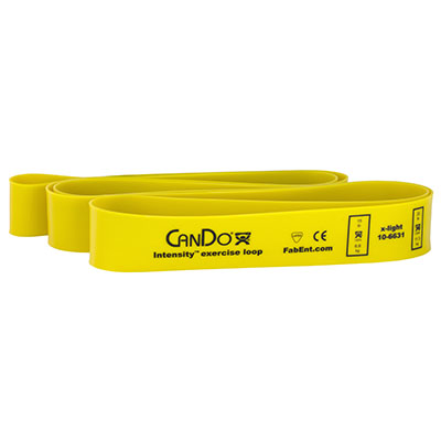 Go beyond traditional exercise bands and crank up the intensity with the CanDo Intensity Loops! One of the most durable bands we offer, the CanDo Intensity Loop is designed to give a greater resistance than our standard CanDo bands. Ideal for athletes and fitness enthusiasts alike, the Intensity Loop assists in powerful strength exercises and total body workouts. Use the Intensity Loops for banded push-ups, pull-ups, squats, deadlifts, resistance weight training and much more. Perfect for using at home, the gym, or on-the-go. Each Intensity Exercise Loop uses AccuForce technology, which features rectangular AccuForce markings that indicate when force is exerted. Reading the force level directly on the stretched loop, you can see the rectangle turn into a perfect square shape. Showing users how much force is being exerted. CanDo Intensity Loops are available in 8 color-coded resistance levels ranging from tan (xx-light resistance) to gold (xxx-heavy resistance). Each different resistance loop has the same width of 1.5" (3.8cm) and lay flat length 41" (1m). This means when the Intensity exercise loop becomes too easy to use, you can move up to a higher resistance loop. This x-light resistance exercise loop comes yellow in color and has the two rectangular markings. Each indicating 100% force exerted at 15 lbs. and 200% force exerted at 25 lbs. Perfectly suitable for beginners or for rehabilitation purposes. Contains latex.