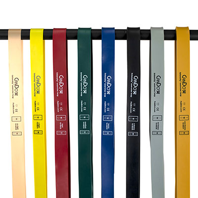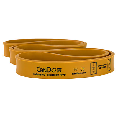 Go beyond traditional exercise bands and crank up the intensity with the CanDo Intensity Loops! One of the most durable bands we offer, the CanDo Intensity Loop is designed to give a greater resistance than our standard CanDo bands. Ideal for athletes and fitness enthusiasts alike, the Intensity Loop assists in powerful strength exercises and total body workouts. Use the Intensity Loops for banded push-ups, pull-ups, squats, deadlifts, resistance weight training and much more. Perfect for using at home, the gym, or on-the-go. Each Intensity Exercise Loop uses AccuForce technology, which features rectangular AccuForce markings that indicate when force is exerted. Reading the force level directly on the stretched loop, you can see the rectangle turn into a perfect square shape. Showing users how much force is being exerted. CanDo Intensity Loops are available in 8 color-coded resistance levels ranging from tan (xx-light resistance) to gold (xxx-heavy resistance). Each different resistance loop has the same width of 1.5" (3.8cm) and lay flat length 41" (1m). This means when the Intensity exercise loop becomes too easy to use, you can move up to a higher resistance loop. This xxx-heavy resistance exercise loop comes gold in color and has the two rectangular markings. Each indicating 100% force exerted at 85 lbs. and 200% force exerted at 120 lbs. It is a great addition for those who want to push their training to the max with explosive exercises. Contains latex.