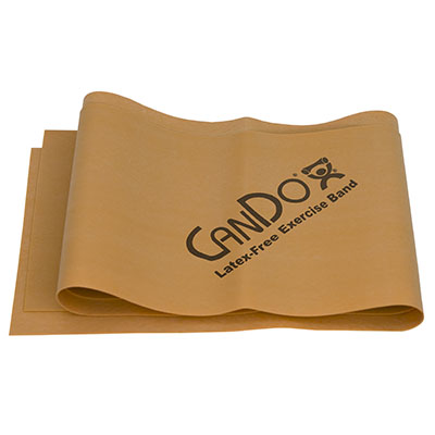 CanDo resistive band exerciser is packaged in a polybag. Simply remove exercise band from polybag and it is ready to use. CanDo high quality synthetic latex-free exercise band has been used for physical therapy and athletic training by clinics, fitness centers and individuals since 1987. It has become a well known staple of many physical therapy programs. The latex free formula has been specially created to mimic the stretch characteristics of latex band. CanDo exercise band is an economic solution for upper and lower body exercise. Lightweight, compact and portable. Durable. Effective when used alone, or with handles and anchors. Color-coded according to the exercise band's resistance. CanDo is licensed to use the Thera-Band color sequence so resistance level is easily identified. Available in 8 levels of resistance for progressive exercise. Levels range in order of resistance from least to greatest resistance: tan, yellow, red, green, blue, black, silver, gold. Each band is 5 inches wide and 5 feet long. Box comes with 30 gold bands which are XXX-Heavy in resistance.
