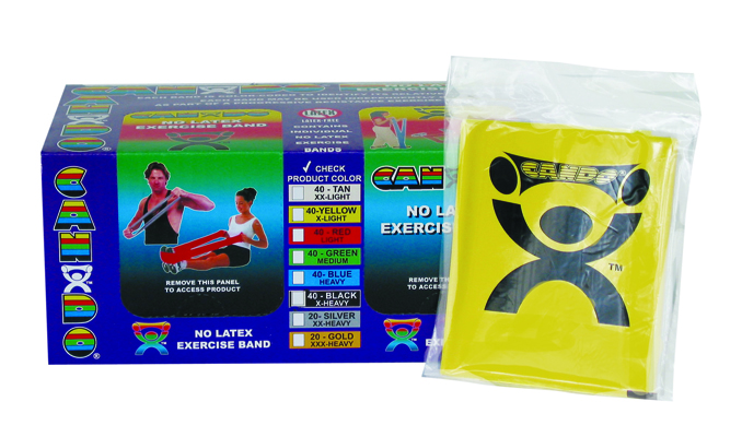 CanDo resistive band exerciser is packaged in a polybag. 40 packages are included in this convenient dispenser box. Simply remove exercise band from polybag and it is ready to use. CanDo high latex free synthetic exercise band has been used for physical therapy and athletic training by clinics, fitness centers and individuals since 1987. It has become a well known staple of many physical therapy programs. The latex free formula has been specially created to mimic the stretch characteristics of latex band. CanDo exercise band is an economic solution for upper and lower body exercise. Lightweight, compact and portable. Durable. Effective when used alone, or with handles and anchors. Color-coded according to the exercise band's resistance. CanDo is licensed to use the Thera-Band color sequence so resistance level is easily identified. Available in 8 levels of resistance for progressive exercise. Levels range in order of strength from least to greatest resistance: tan, yellow, red, green, blue, black, silver, gold. Uniform width - each band is 5" wide.