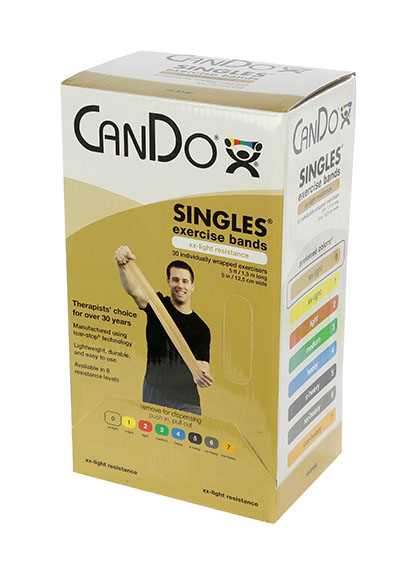 CanDo resistive band exerciser is packaged in a polybag. Simply remove exercise band from polybag and it is ready to use. CanDo high quality latex resistive exercise band has been used in clinics for rehabilitation, conditioning and training since 1987. It has become a well known staple of many physical therapy programs. CanDo exercise band is an economic solution for upper and lower body exercise. Lightweight, compact and portable. Durable. Effective when used alone, or with handles and anchors. Color-coded according to the exercise band's resistance. CanDo is licensed to use the Thera-Band color sequence so resistance level is easily identified. Available in 8 levels of resistance for progressive exercise. Levels range in order of resistance from least to greatest resistance: tan, yellow, red, green, blue, black, silver, gold. Each band is 5 inches wide and 5 feet long. CanDo low powder exercise band is made of natural rubber latex, which may cause allergic reactions. For those with latex sensitivities, there are latex-free alternative offerings of CanDo exercise band. The tan band is XX-Light in resistance and comes in a 30 piece dispenser.