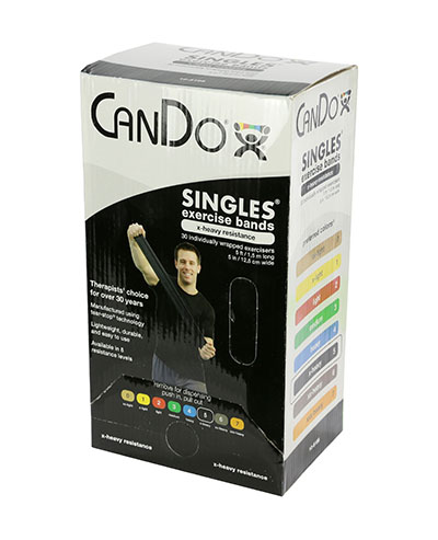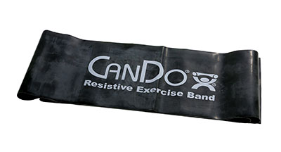 CanDo resistive band exerciser is packaged in a polybag. Simply remove exercise band from polybag and it is ready to use. CanDo high quality latex resistive exercise band has been used in clinics for rehabilitation, conditioning and training since 1987. It has become a well known staple of many physical therapy programs. CanDo exercise band is an economic solution for upper and lower body exercise. Lightweight, compact and portable. Durable. Effective when used alone, or with handles and anchors. Color-coded according to the exercise band's resistance. CanDo is licensed to use the Thera-Band color sequence so resistance level is easily identified. Available in 8 levels of resistance for progressive exercise. Levels range in order of resistance from least to greatest resistance: tan, yellow, red, green, blue, black, silver, gold. Each band is 5 inches wide and 5 feet long. CanDo low powder exercise band is made of natural rubber latex, which may cause allergic reactions. For those with latex sensitivities, there are latex-free alternative offerings of CanDo exercise band. The black band is X-Heavy in resistance and comes in a 30 piece dispenser.