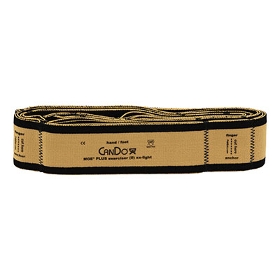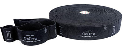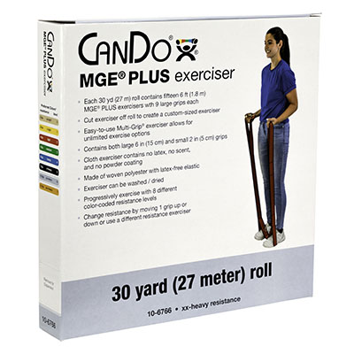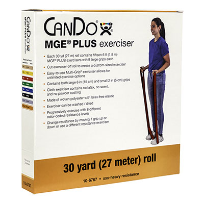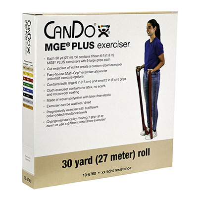 The CanDo Multi-Grip Exerciser is designed to provide unlimited exercise options to users who want to do various high impact performance exercises. Each exerciser contains both large and small loops that are easy to grip. Use the small loops as an anchor or for finger exercises. Use the larger loops around the hands and feet to perform high impact upper and lower body exercises. Easily change resistance by moving 1 loop up or down the exerciser, or using a different resistance progressively exercise with 8 different color-coded resistance levels. The CanDo Multi-Grip Exerciser is made of an unscented cloth that can be washed and dried. It does not contain latex or a powder coating. This thirty-yard roll contains 15 exercisers and has 135 large loops total. It is XX-Light in resistance and is tan in color.