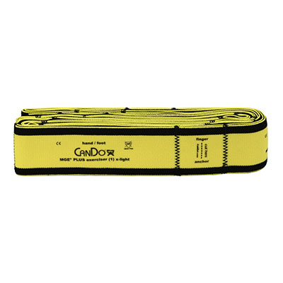 The CanDo Multi-Grip Exerciser is designed to provide unlimited exercise options to users who want to do various high impact performance exercises. Each exerciser contains both large and small loops that are easy to grip. Use the small loops as an anchor or for finger exercises. Use the larger loops around the hands and feet to perform high impact upper and lower body exercises. Easily change resistance by moving 1 loop up or down the exerciser, or using a different resistance progressively exercise with 8 different color-coded resistance levels. The CanDo Multi-Grip Exerciser is made of an unscented cloth that can be washed and dried. It does not contain latex or a powder coating. This thirty-yard roll contains 15 exercisers and has 135 large loops total. It is X-Light in resistance and is yellow in color.