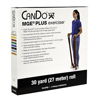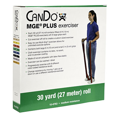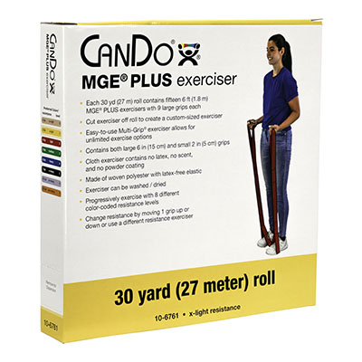 The CanDo Multi-Grip Exerciser is designed to provide unlimited exercise options to users who want to do various high impact performance exercises. Each exerciser contains both large and small loops that are easy to grip. Use the small loops as an anchor or for finger exercises. Use the larger loops around the hands and feet to perform high impact upper and lower body exercises. Easily change resistance by moving 1 loop up or down the exerciser, or using a different resistance progressively exercise with 8 different color-coded resistance levels. The CanDo Multi-Grip Exerciser is made of an unscented cloth that can be washed and dried. It does not contain latex or a powder coating. This thirty-yard roll contains 15 exercisers and has 135 large loops total. It is Light in resistance and is red in color.