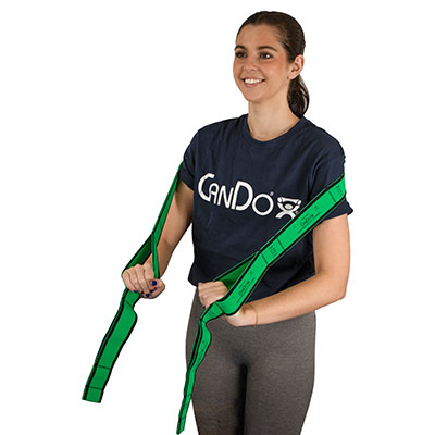 The CanDo Multi-Grip Exerciser is designed to provide unlimited exercise options to users who want to do various high impact performance exercises. Each exerciser contains both large and small loops that are easy to grip. Use the small loops as an anchor or for finger exercises. Use the larger loops around the hands and feet to perform high impact upper and lower body exercises. Easily change resistance by moving 1 loop up or down the exerciser, or using a different resistance progressively exercise with 8 different color-coded resistance levels. The CanDo Multi-Grip Exerciser is made of an unscented cloth that can be washed and dried. It does not contain latex or a powder coating. This exerciser measures six feet in length and has 9 large loops. It is Medium in resistance and is green in color.