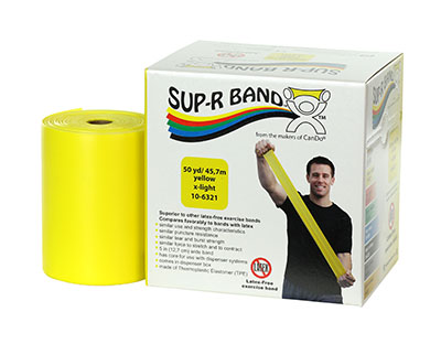 Sup-R Band Latex-Free Exerciser Rolls are perfect for rehabilitation, fitness, physical therapy and athletic training. Additionally, they are great for anyone using them for stretching, muscle toning, improving balance and conditioning all major muscle groups. Packaged in a dispenser box, simply unroll the desired length of exercise band from the box and cut with scissors. The Sup-R Exercise Band is the premium exercise band solution, being Latex-free while still providing all the functionality and benefits of a band with Latex. So versatile, these bands are super for upper and lower body exercises that are simple, easy to do and can be performed anywhere. Lightweight, compact and portable, the TPE Latex-free formula mimics the stretch, contraction and strength characteristics of a Latex band. The high quality and superior characteristics of these bands are why they are used in physical therapy and athletic training by clinics, fitness centers and individuals nationwide. This is a 6-yard roll of the Yellow (X Light) Band. Exercise bands are effective when used alone or with handles and anchors. Made with Thermoplastic Elastomer, which gives the bands the same tear and burst strength as a Latex-band. They are a well-known staple of most physical therapy offices, clinics and gyms because they are durable, powderless and textured for easy gripping. The 6-yard rolls come ready to use in a dispenser box. Bands are available in 8 levels of resistance for progressive exercise. Levels range in order of strength from least to greatest resistance: tan, yellow, red, green, blue, black, silver, gold.