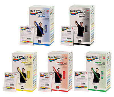 Sup-R Band Latex-Free Exerciser Bands are perfect for rehabilitation, fitness, physical therapy and athletic training. Additionally, they are great for anyone using them for stretching, muscle toning, improving balance and conditioning all major muscle groups. They come in a dispenser box of pre-packaged 5'singles. The Sup-R Exercise Band is the premium exercise band solution, being Latex-free while still providing all the functionality and benefits of a band with Latex. So versatile, these bands are super for upper and lower body exercises that are simple, easy to do and can be performed anywhere. Lightweight, compact and portable, the TPE Latex-free formula mimics the stretch, contraction and strength characteristics of a Latex band. The high quality and superior characteristics of these bands are why they are used in physical therapy and athletic training by clinics, fitness centers and individuals nationwide. This is a 5-piece set featuring 1 (one) 30-count box of 5' Singles of each of the Yellow, Red, Green, Blue and Black Bands. Exercise bands are effective when used alone or with handles and anchors. Made with Thermoplastic Elastomer, which gives the bands the same tear and burst strength as a Latex-band. They are a well-known staple of most physical therapy offices, clinics and gyms because they are durable, powderless and textured for easy gripping. Individual strips can be reused repeatedly. Bands are available in 8 levels of resistance for progressive exercise. Levels range in order of strength from least to greatest resistance: tan, yellow, red, green, blue, black, silver, gold.
