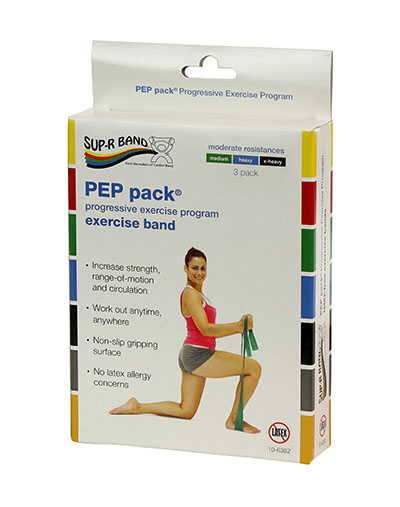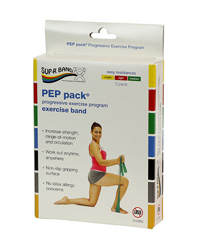 The easy resistance PEP pack includes one yellow, red, and green resistance band and exercise chart. 5" width; made of Thermoplastic Elastomer (TPE); color-coded in Thera-Band colors. Each 5-foot piece is packaged in a polybag.