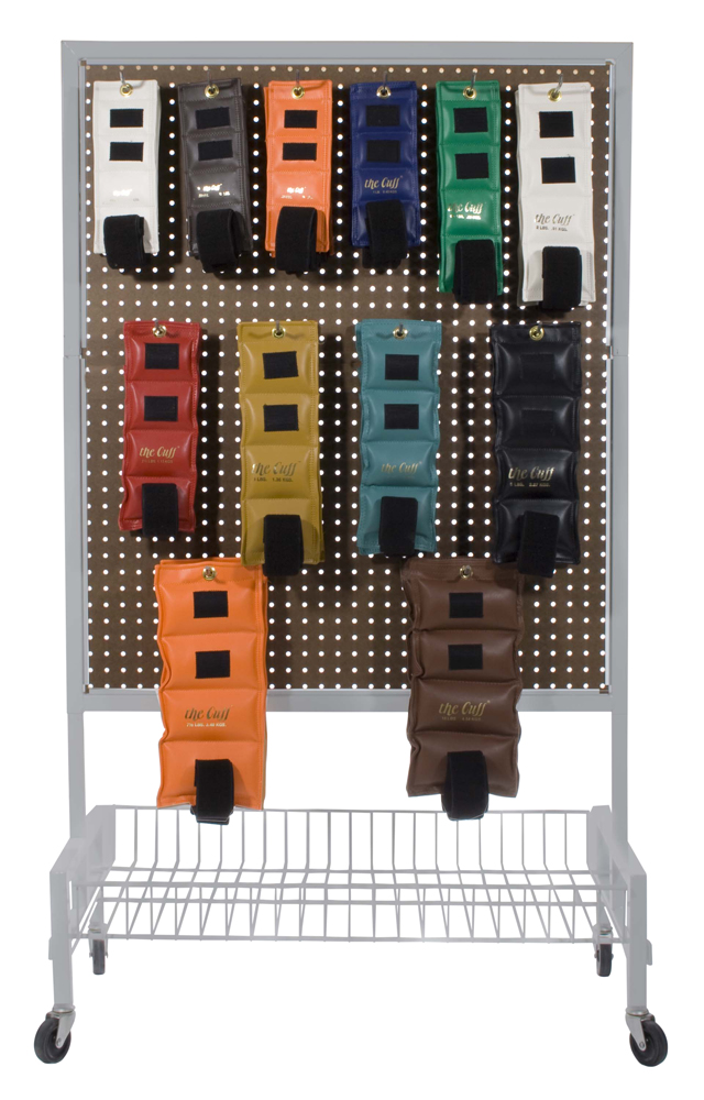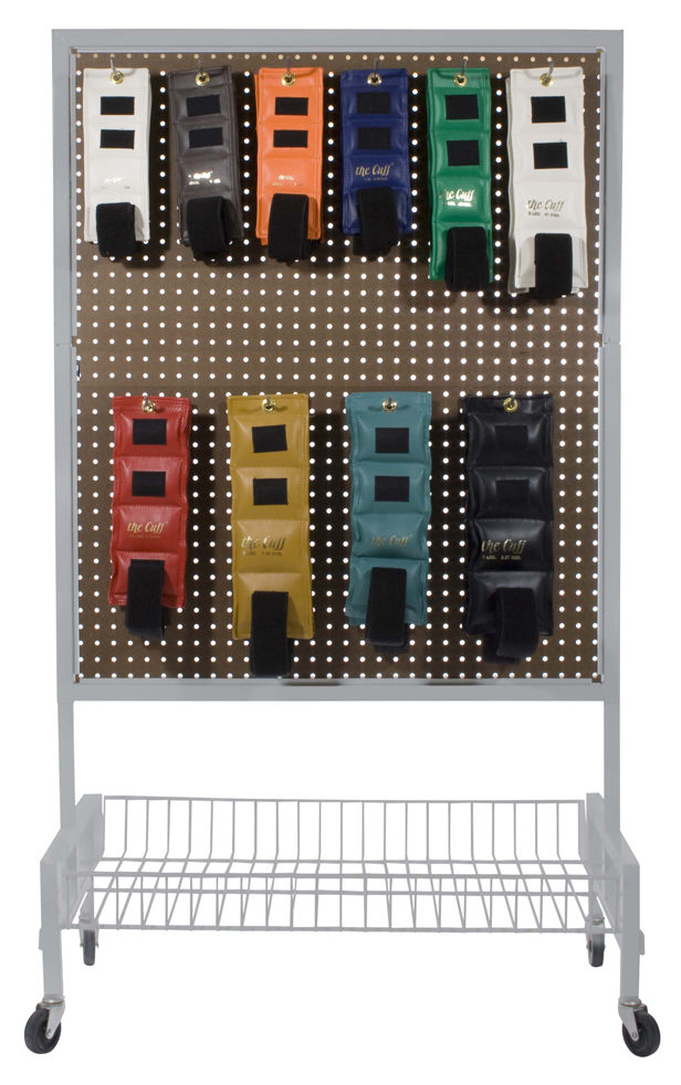This mobile weight rack made of heavy-duty steel is the ideal tool to keep Cuff wrist and ankle weights and accessories organized. Capable of holding up to 500 lbs. The double-sided pegboard allows multiple options in how weights are stored and organized. Additional capacity available in lower storage tray. Mobility is a breeze as the 3-inch wheels allow the rack to be easily moved, even over carpet. Rack measures 24" x 35" x 48". Includes a fully illustrated guide to assembly.