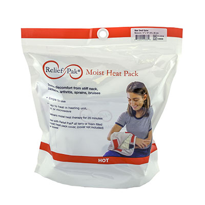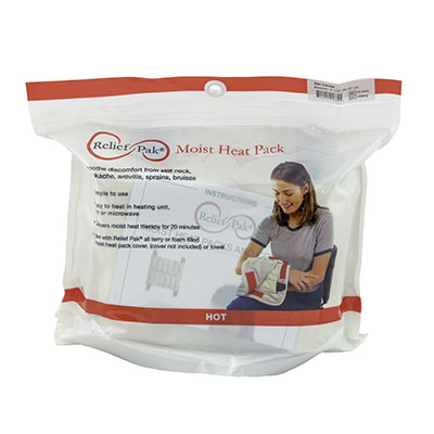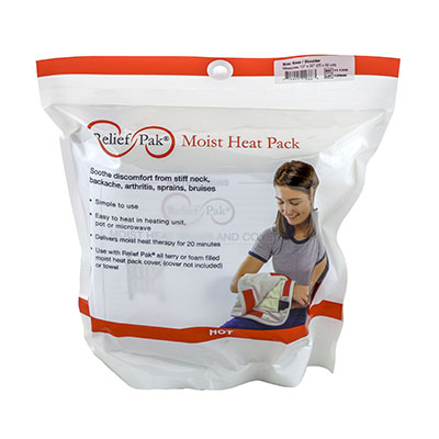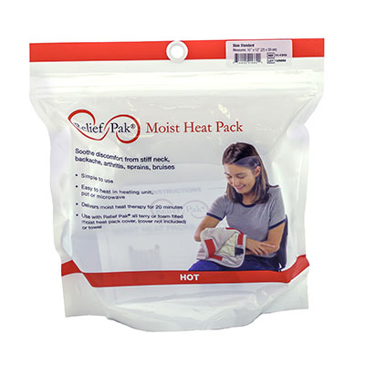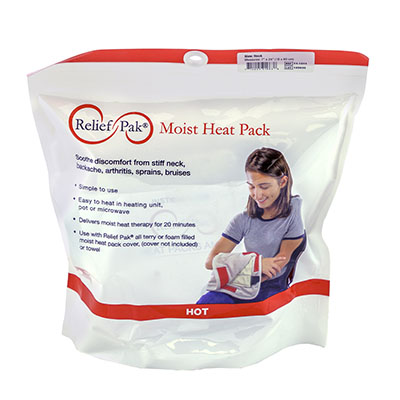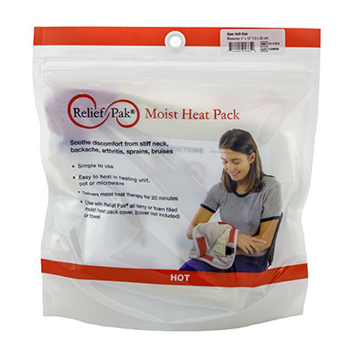Relief Pak moist heat packs and covers are a simple and effective method of applying moist heat. The moist heat packs provides 30 minutes of therapeutic moist heat to soothe discomfort from stiff neck, backache, arthritis, sprains and bruises. The pack can be heated in water on a stove, in a microwave or in a heating unit. When treatment is complete, the pack can be stored for future use. Always apply moist heat pack with a Relief Pak cover or a heavy towel completely wrapped around the pack.