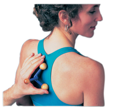 Hand crafted from a steel bar, bent in the shape of an "S" with wooden balls, one relatively small and one somewhat larger, permanently affixed to each end. To use, hook the device over the shoulder or under the arm and use its leverage to apply direct, deep, steady pressure to trigger points in the muscle groups. Long: 29" length, for people over 6 feet tall.
