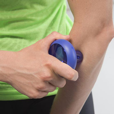 The Knobble II massage tool is the new design of the all wood favorite. Made of durable polymer with a band of non-latex, Santoprene, The Knobble II gives your hand more power when you need it. Use either the tip or the base for applying pressure on yourself or others. Use the Santoprene edge for light friction. The Knobble II doesn't replace your healing hands, it just helps them do more and last longer. Wehn held in the palm, and the smoothly rounded stem is used to apply pressure to trigger points in soft tissue. Minimizes wear-and-tear to the therapists hands. Comes blue in color and is proudly made in the USA.
