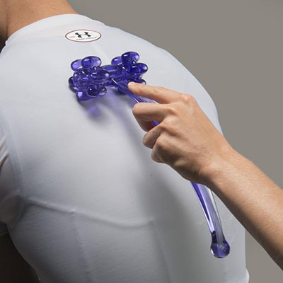 The knobs of the four legs of the Jacknobber II massage tool can be used in many ways to apply deep pressure to myofascial trigger points and areas of muscle tension. Equally comfortable in small or large hands. Even children enjoy its ergonomic shape! The smaller knobs provide more intense pressure while the larger knobs provide a more diffuse pressure. Use one knob at a time to press deeply into taut bands with embedded trigger points. Use two knobs at a time on either side of the spine. Use all three to gently sweep across broad muscles of the back, glutes, legs, shoulders and torso. Best used over lightweight clothing. Arguably this is the most satisfying and easy to use hand held massage tool available. Comes purple in color and is proudly made in the USA.