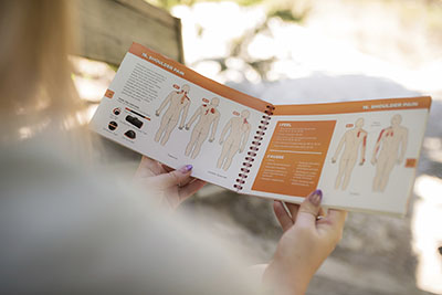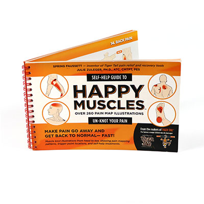 The Happy Muscles Guide Book is a self-help guide on how to smooth knots and release tightness in muscles. This book empowers the user to help identify what might be causing them pain, while giving the user the ability to make pain go away. This trouble-shooting guide features more than 250 pain-mapping muscle knot illustrations. It illustrates pain patterns, muscle knot locations, and self-help treatments for the entire body in an easy-to-follow format.