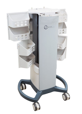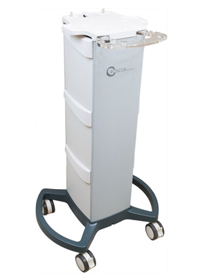 The TheraTouch Clinical Cart is a state-of-the-art rolling cart with double side drawer and storage. The cart will fit the EX4 or CX4 Clinical Devices and offer the practitioner a wide range of mobility options with four wheel rolling motion capabilities. The wheels have an easy-to-lock brake system that can be pressed with the foot.