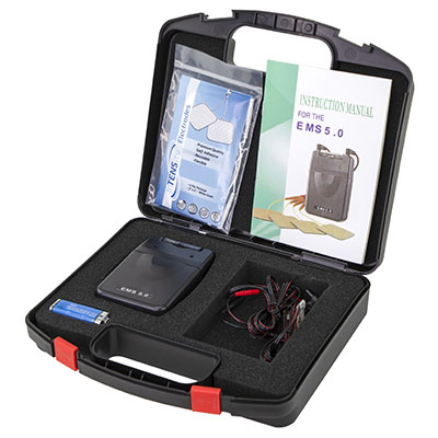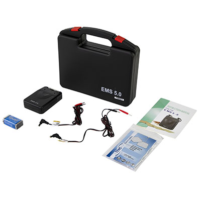 The EMS 5.0 unit uses electrical impulses to contract and relax muscles helping those who experience muscle tension in the upper back and neck areas. Can be used to regain muscle strength after surgery or after being in a cast. The EMS unit is portable and may be clipped to a belt, shirt, pocket or other clothing. System includes device, lead wires, four self-adhesive reusable electrodes, 9-volt battery, hard plastic carrying case and instruction manual. 105 mA strong. Power Source: 9-volt battery. Channel: Dual, isolated between channels. Pulse Width: 250 microseconds. Pulse Rate: 5, 30, 100 Hz. Pulse Ramp: 1, 3, 5 seconds. Pulse Amplitude: Adjustable, 0-80 mA. Contraction Control: 1-30 seconds. Relaxation Control: 1-45 seconds. Wave Form: Asymmetrical Bi-Phase Square Pulse.