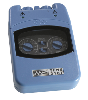 The TENS 210T is a battery-operated two-channel transcutaneous electrical nerve stimulator that creates electrical impulses. Intensity, duration, number per second and modulation of those impulses can be altered with easy to use controls or switches, all in a light-weight package. Has timer.