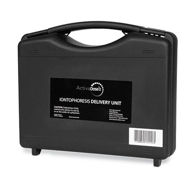 Experience professional-grade iontophoresis delivery with the ActivaDose II's intuitive dual-control system. Choose between push-knob or turn operation to precisely adjust dose and current settings with confidence. The high-contrast display provides crystal-clear visibility of dose, time, and current readings from any angle, ensuring accurate monitoring throughout treatment sessions. Smart automatic current ramp-up and ramp-down technology maximizes patient comfort while delivering therapeutic effectiveness. Time calculations update instantly when you adjust dose or current settings, and seamlessly accommodate pause/restart cycles. Deliver exact therapeutic doses from 0 to 80 mA-min in precise 0.1 mA-min increments, giving you complete control over treatment parameters. Comprehensive visual and audible alert system monitors resistance limits, dose parameters, current thresholds, and electrode integrity, ensuring safe and effective treatments every time. Each ActivaDose II device includes everything needed to begin treatments immediately: Single Channel Controller, 2 lead wires, 2 9-volt batteries, and comprehensive instruction manual.