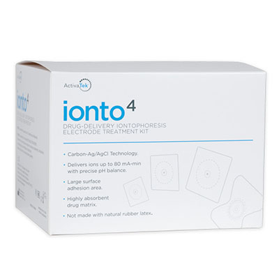 Ionto4 Iontophoresis Electrodes contain synthetic pH stabilizing buffering agents in each electrode that guard against polarity shifts in the drug solution, helping to maintain consistent and efficient drug delivery throughout the iontophoresis treatment. Rated for treatments of up to 4.0 mA. These electrodes use a proprietary silver-silver chloride conducting element to improve drug delivery compared to carbon-based iontophoresis electrodes. Water activation is not needed. Thus, eliminating impurities being added from water contamination. The electrodes feature a large adhesive area to maximize current distribution for better patient comfort and ensures placement is maintained throughout the treatment. Ionto4 Iontophoresis Electrodes come in four sizes (three square sizes plus butterfly), providing an assortment of options for drug capacity and placement options. Box includes 12 individual treatment kits. Each kit includes 1.5 cc, 4mA small square iontophoresis electrode, buffered return electrode, 1 alcohol prep pad.