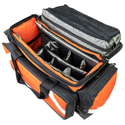 The Elite EMS Trauma Bag by LINE2design was specifically designed for organization and the durability necessary for every first responder with zippered pockets on both sides of the bag, as well as both ends, and a zippered mesh pocket on top. It has internal dividers and a padded bottom that are fully removable for easy cleaning and adjustable storage. The LINE2design Elite EMS Trauma Bag is ruggedly structured and never loses its shape. It also comes complete with a convenient carrying handle as well as a fully adjustable shoulder strap for carrying it in any situation. Included: (1) Orange First Aid Bag 25.25" x 13.75" x 11.5", 20 Waterproof Adhesive Bandages, 2 Emergency Mylar Blankets, 1 Triangular Bandage, 2 CPR Clear Masks, 1 EMT Shears-Black 7.5", 1 Disposable Diagnostic Penlight, 1 Dressing Forceps 4", 2 Elastic Bandages, 4 Clear Rolls of Tape 1", 6 Conforming Stretch Gauze 2", 6 Conforming Stretch Gauze 3", 6 Conforming Stretch Gauze 4", 2 Instant Cold Packs, 2 Instant Hot Packs, 20 Cleaning Hand Wipes, 10 Triple Antibiotic Ointments, 3 Pair Disposable Gloves, 1 Flex-All Splint, 1 CPR Rescue Mask, 2 Sterile Multi Trauma Dressing, 1 Burn Sheet, 1 Sprague Stethoscope, 1 Adult Blood Pressure Cuff, 1 Adult BVM Resuscitator Mask, 2 NRB O2 Masks, 1 Berman Oral Airway Kit, 1 Pair Safety Glasses, 2 Disposable Tourniquet, 1 L2d Shove Knife w/cover, 1 Lifesaver Hammer, 1 Burn Spray, 2 oz., 2 Quick-Stopper Gauze Bandage, 1 Sting Relief Spray, 2 oz., 10 Ammonia Inhalants, 10 4x4 Gauze Pads.