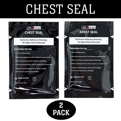 The LINE2design Chest Seal is an advanced occlusive dressing designed to treat open chest trauma.?The Chest Seal is used when there are penetrating injuries to the chest that result in open chest wounds that may lead to traumatic tension pneumothorax. Used by Military, Police, Fire, EMS and First Responders. Large square 5.75" x 5.75" for maximum coverage area. Large pull tab for easy peel and application. Transparent backing for easy placement over the traumatic chest wound. Strong medical grade hydrogel adhesive for superior bond. Conforms and adheres to all body surfaces. Sterile. Latex-free. Non-vented. Easy to open vacuum sealed package. Individually packaged. FDA 510(k) Exempt.