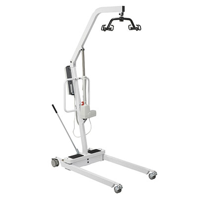 The Bariatric Battery Powered Electric Patient Lift features an extra wide, coated cradle that rotates 360 degrees and includes a 4-point hook up. It has a high lift range which allows the unit to transfer patients to high surfaces. The battery can be charged by plugging in the unit, and never needs to be removed. When plugged in to charge, the lift will not operate. To ensure safe patient repositioning, there is a jumbo actuator pump to lower the patient. The pump even includes an emergency button and can be switched to manual mode. Sturdy base legs - with dual, 3" heavy duty front casters - adjust easily and lock securely into open position with padded shifter handles. The lift has a 600-pound weight capacity and is not wall mountable.