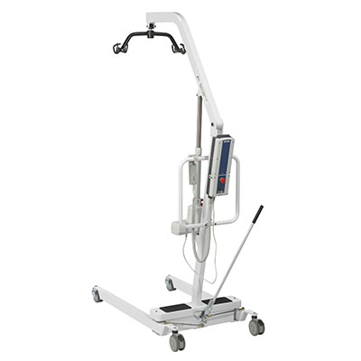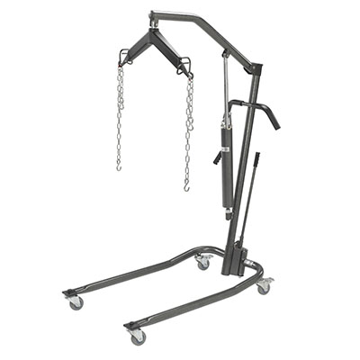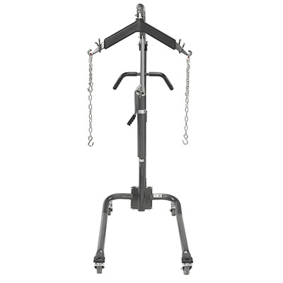 Hydraulic Powered Patient Lift, chrome-plated steel provides maximum strength. High-performance hydraulics raise or lower individuals gradually and safely. Easy-to-operate caster brakes provide security. Includes sling chains. 450 lb weight capacity.
