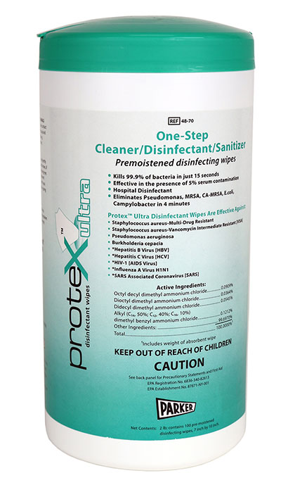 Effective and efficient disinfecting has never been more important. Protex Ultra Wipes start killing germs on contact, they will eliminate 99.9% of bacteria in 15 seconds and disinfect in just 4 minutes. That's why these Protex Ultra Disinfectant Wipes from Parker Labs are found in most medical offices and hospitals. This powerful one-step cleaner and disinfectant combo is effective against a broad spectrum of pathogens including MRSA, HIV, H1N1, MRSA, staph and many others. In regard to Coronavirus, COVID-19 is caused by SARS-CoV-2, a novel coronavirus. Protex Ultra Wipes have proven effective in killing similar viruses and therefore can be used against SARS-CoV-2 when used in accordance with the directions for use against Norovirus (Norwalk Virus) on hard, non-porous surfaces. Each wipe is generously sized at 7" x 9.5", allowing each wipe to clean a significant area. Wipes come in a canister of 75. Not just for furniture, these wipes are ideal for disinfecting equipment too. Use on transducers and probes, mammography compressor plates, dental equipment and more. These wipes are at home in emergency vehicles, exercise facilities, school nurse offices and locker rooms. Ideal for use on vinyl exam tables, athletic mats, exercise equipment, counter-tops and other non-porous surfaces. Protex Ultra Wipes are alcohol, bleach, and solvent free. Accepted for use by manufacturers of ultrasound equipment.