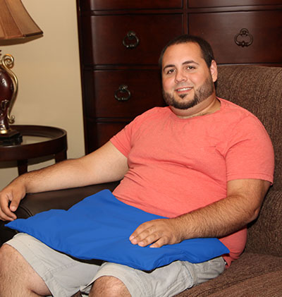 The Sit Tight Wipe-Clean Weighted Lap Pad is a hospital grade device perfect for locations where machine washing is unavailable or inconvenient. Contoured at the waist to fit the body without bunching up, this lap pad, provides a deep pressure touch on the lap that's ideal for both children and adults looking to improve focus, increase attention span and stay seated longer. Smaller than a weighted blanket and designed to stay on the lap while seated, this is the perfect device to help get and retain focus for sit down tasks and to stay calm for activities. The Wipe-Clean features fabric that is waterproof, breathable, tear resistant, anti-microbial and pleasant to touch. This Royal Blue Sit Tight is sized Large and weighs 6 lbs. It is 24.5" x 17" and ideal for an individual who weighs between 81-140 lbs. The Sit Tight works great on its own or complements other weighted items such as shoulder wraps or wrap arounds. The Wipe-Clean is flame resistant (Class A Barrier) and non-toxic. Because it is not machine washable, each package contains a detailed list of cleaning and disinfecting instructions. So versatile, the Sit Tight helps with desk work, mealtime or whenever calm sitting time needs to be found or increased. The Sit Tight is made in the USA.