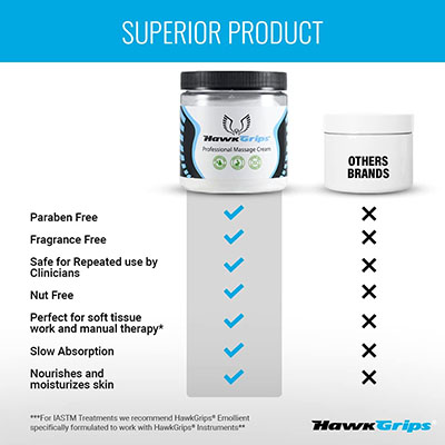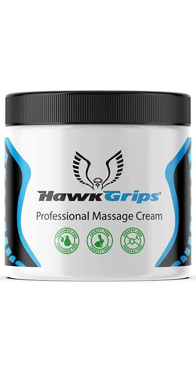 HawkGrips continues its dedication to both clinician and patient with their New HawkGrips Professional Massage Cream. Carefully formulated with clean ingredients, the Professional Massage Cream creates the perfect therapist glide for soft tissue work or any type of manual therapy. Use it with any HawkGrips tool! This remarkable massage cream softens and moisturizes the user's skin while providing excellent coverage and lubricity. The non-greasy, non-staining formula provides superior workability with both clinician and patient comfort in mind. The HawkGrips Professional Massage Cream is fragrance free and comes in an 8 oz. jar.
