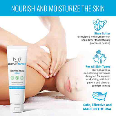 HawkGrips Therapeutic Massage Lotion was created in collaboration with healthcare professionals like you. The HawkGrips Therapeutic Massage Lotion combines exceptional performance and safety in a hygiene-focused tube. Benefit from our formula's unparalleled quality and value. Make a smart addition to your practice with HawkGrips. Whether you're conducting soothing, fluid strokes or intensive deep tissue techniques, HawkGrips is your adaptable ally in all therapeutic sessions. We believe that ingredients matter. That's why our paraben-free, unscented formula is enriched with sunflower oil and shea butter, designed for safe, repeated use. HawkGrips nourishes the skin without causing irritation. Packaged in a tube to minimize cross-contamination, our non-greasy lotion ensures hygiene with each use. Keep your patients' skin soft and your clinic's linens spotless with HawkGrips. Say goodbye to the worry of stains. Enjoy more with our generous 8oz tube, perfect for busy clinics and mobile practitioners alike. Each tube of HawkGrips Therapeutic Massage Lotion meets the highest quality standards. Transparency is key, so we encourage you to read our labels and understand our ingredients. Ingredients matter! It's not just a product; it's a practitioner's choice. Your practice deserves the best. Made in the USA.