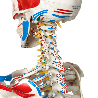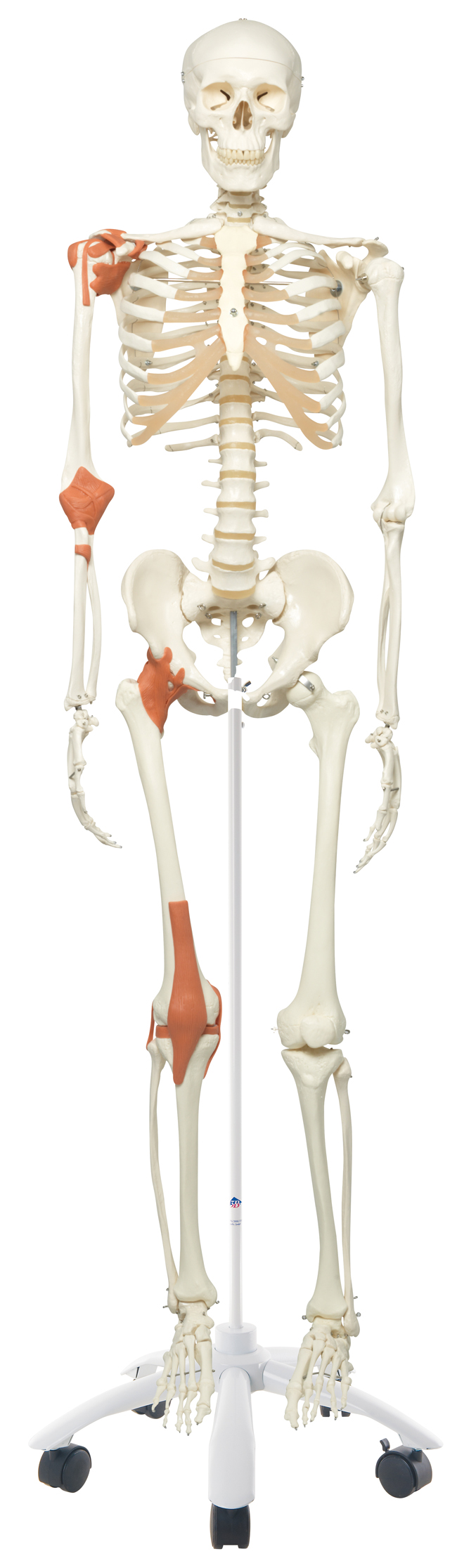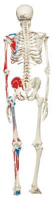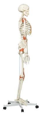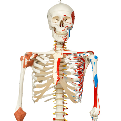 Max is a full-size skeleton with muscles model. On the left side of the skeleton over 600 important medical and anatomical structures are shown, such as the muscle origins (red) and insertions (blue) as well as hand-numbered bones, fissures and foramina on the right side. Used in hospitals, schools, universities, and laboratories. The skeleton is ideal for active use in teaching and demonstrations. The skeleton is waist mounted on a metal roller stand (painted white). Measures at: 69.5" and 21.1 lb. Features: 3-part skull, individually inserted teeth, removable arms and legs, natural cast, transparent dust cover and 3 year guarantee. Now included with all 3B Scientific Anatomy models is the 3B Smart Anatomy app. This app allows users to register their 3B item to extend the warranty from 3 to 5 years plus free 1 year access to the 3B Smart Anatomy app which includes 23 Anatomy lectures, 117 interactive models and 39 quizzes.