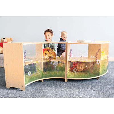 Create a unique nature-inspired toddler area! This 41-in wide, 24.25-in high room divider is a gracefully curved clear acrylic panel that softens corners and features an inviting nature scene that brightens and defines any room environment while providing maximum child visibility and supervision. Use the connector panel accessory [included] to connect the panel to other pieces in our award-winning biophilia inspired Nature View Collection [each sold separately] and create a flexible divided area layout in the warmth of wood and nature without unsightly plastic connectors. All corners and edges are rounded over and finished smooth for safety.