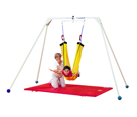 The Vestibulator II freestanding system offers the benefits of a ceiling suspension system. It accommodates therapy modules for vestibular, neurodevelopmental, and sensory integration therapy. The Deluxe System provides vertical stimulation and direct flexion, linear acceleration, rotational experiences, and complete range of motion exercises. It incorporates a 360 degree vertical rotation system for a smooth, unrestricted ROM to create vertical and rotational stimulation at the same time. Overall floor dimensions: 9'11"W x 6'5"D. Overall height is 7'0". Tumble Forms 2 Deluxe Vestibulator II System features: Height adjustment assembly allows quick changes to the proper position. Mechanism can be fixed in a stable position or set for swinging. Accessory pieces are lightweight and easy to maneuver. Durable metal frame has a working load of 150 pounds. Legs remove for portability and storage. Deluxe Vestibulator II System includes: Frame, Net Swing with positioning seat, Flexidisk, Prone net swing, Mat, Soft Top Platform Swing, Roll swing, Rope with Ascenders.