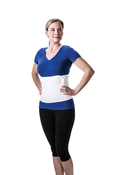 The Abdominal Binder gently supports the belly to promote healing after abdominal injury or surgery; ideal for use after a caesarean section, bariatric surgery, exploratory laparotomy, hysterectomy, tummy tuck, or some spinal surgeries to help support the abdomen and maintain proper intra-abdominal pressure. This low profile support helps supplement the abdominal muscles and ligaments weakened by: injury, surgery, postpartum, or loss of muscle tone. By gently compressing the abdomen, this support helps reduce strain on an incision. It also provides mild back support and can also be used to wrap the abdomen after delivery for tummy reshaping. Made from 9 inch high elastic material that stretches and contracts, this support contours to the natural shape of the body for increased comfort. The plush hook and loop material provides light support for the back while the durable, multi-tiered elastic material hugs the belly to help prevent the support from slipping, bunching, or rolling during daily activities. Soft elastic CorEdge finish on top and bottom edges offers added comfort and flexibility.