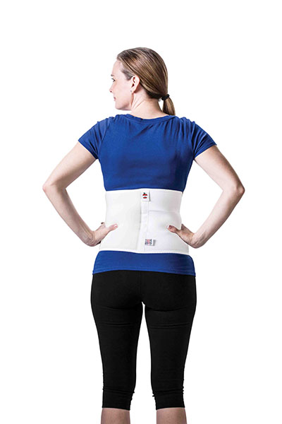 AliMed Three Panel 9"H Abdominal Support braces abdomen to reduce muscle fatigue and strain. Reduces musculoskeletal vibration caused by driving, sports, and physical labor. Evenly distributes compression. Hook-and-loop closure. Hand wash. Air dry. Not made with natural rubber latex. White. Sizing: SM/MD fits waist circumference 30"-45". LG/XL fits waist circumference 46"-62".