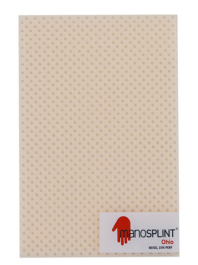 Manosplint Ohio material is a coated material that will not adhere to itself until the coating is removed. Ohio becomes translucent when it is heated, allowing the therapist to clearly see target areas and minimize patient discomfort. The perforated surface allows for air circulation with sacrificing rigidity. Ohio is available with 1%, 11%, 15%, 19%, 36%, and 42% surface perforation.