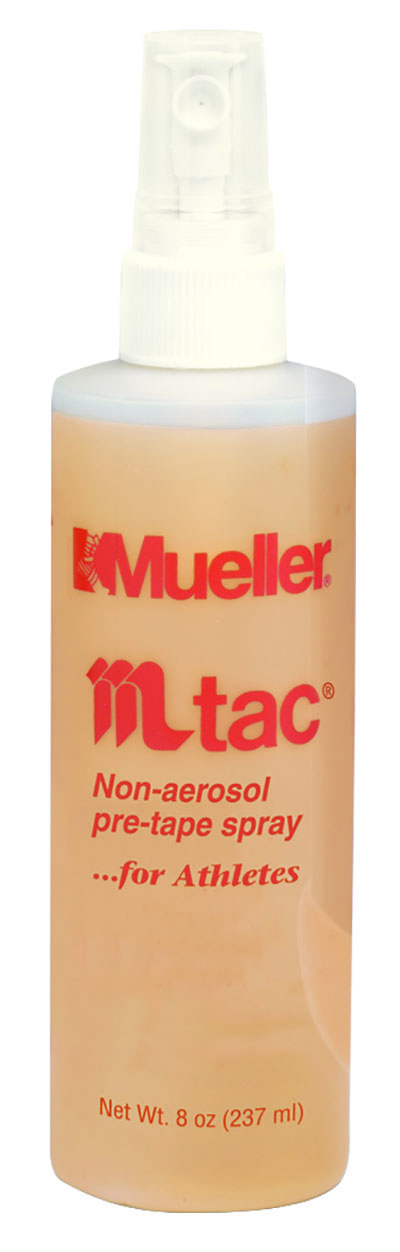 Mueller M Tac Non-Aerosol Pre-Tape Spray helps MTape and MWrap stick better. Spray on an even coat before wrapping. Convenient non-aerosol formula is fast-drying and won't stain. This spray is 8 oz and comes in a package of 12.