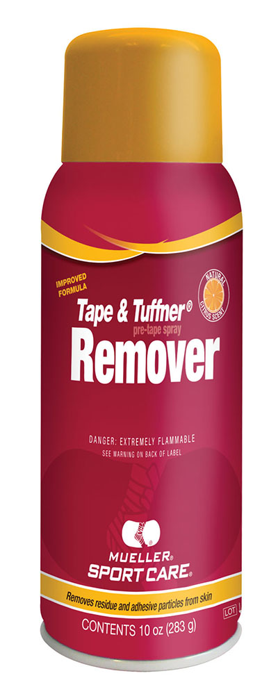 Mueller Tape & Tuffner Remover removes pre-tape spray and adhesive particles from the skin, countertops and taping benches. This spray has a citrus scent and is 10 oz.