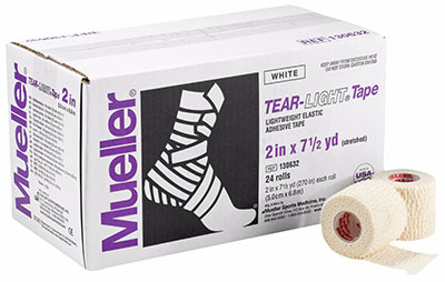 Mueller Tear-Light Tape features a superior adhesive with excellent conformability. It features easy to tear elastic adhesive which is ideal for securing lateral knee braces, cold packs, or use as a compression wrap. This product does not contain latex. This tape measures 2" x 7.5 yards and comes in a package of 24 rolls.