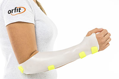 Orfit Natural NS Soft material is anti-bacterial and ideal for hand orthoses. This material is non-stick coated, designed to not accidentally bond. It does allow for temporary bonding during creation, and permanent bonding is possible when the coating is removed and dry heat is applied. When ready for molding, the material turns transparent. This material features a smooth, white finish. The item shown is Orfit Natural NS Soft, 18" x 24" x 1/16", non perforated.