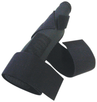 Comfortable universal thumb spica immobilizes the thumb joint, gives gentle protective positioning of the MP and CMC joints, and provides wrist support. Made of compression-formed foam with no seams. Elastic closure straps enable easy application and removal. Universal sizing. Fits right or left thumb.